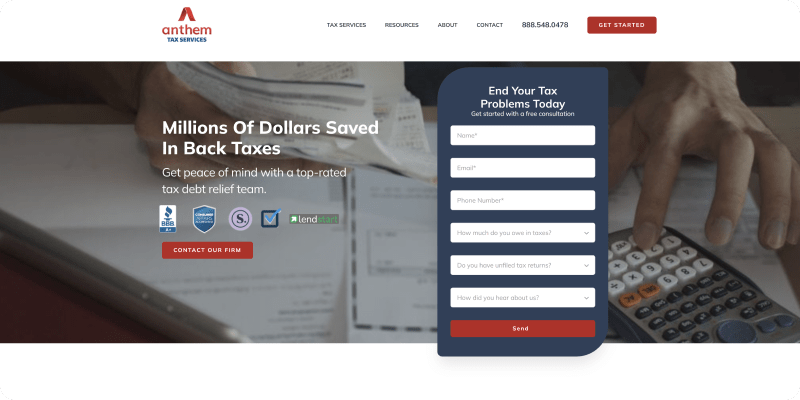 As previously stated, a back taxes of at least $10,000 will qualify you for the tax relief-focused services of this company. The whole process, from the free consultation until the execution of the plan will be done remotely under the strict supervision of financial experts. It must be noted that the Anthem Tax Services website lacks a lot of information concerning the costs that are involved when working with them, which is not a very good thing. Because of this, there have been many misunderstandings between them and their clients based on different expectations and most of the negative reviews found online are because of this detail.
